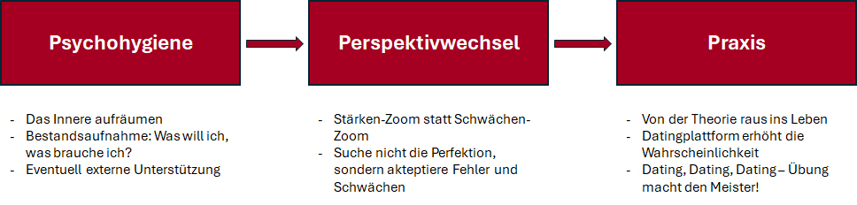 Wie also raus aus dem Dauerschleifen-Singlemodus? Nicht mit Selbstbeschimpfung, sondern mit einer freundlichen, klaren Strategie. Stell dir deine Liebesreise wie einen Dreiklang vor: Psychohygiene, Perspektivwechsel, Praxis.